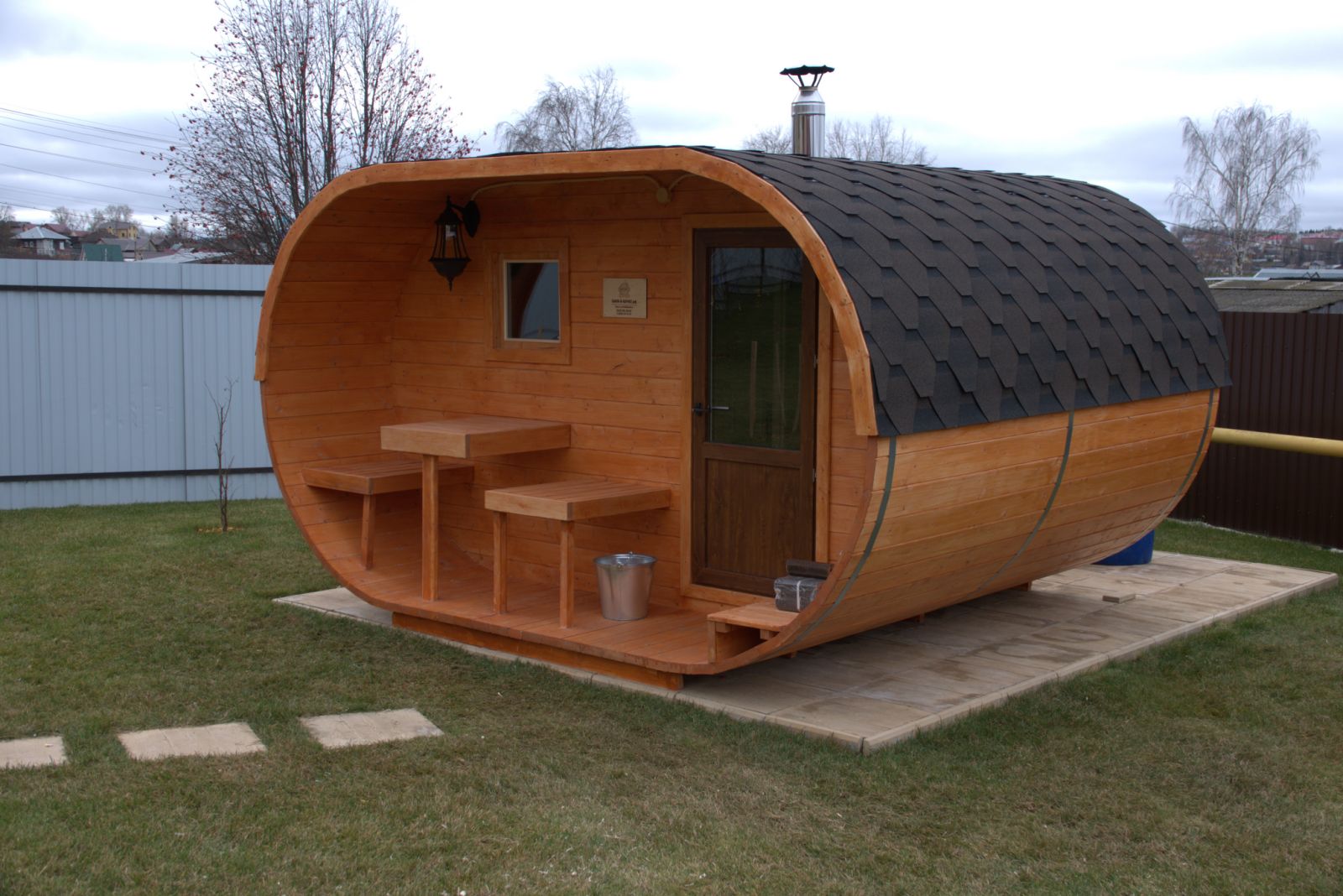 Круглая форма бани и печка избыточной мощности обеспечивает быстрое время нагрева. Причина в том, что нет углов, где тепло может попасть в ловушку. Это означает сокращение объема на 29% и более эффективное использование тепловой энергии.